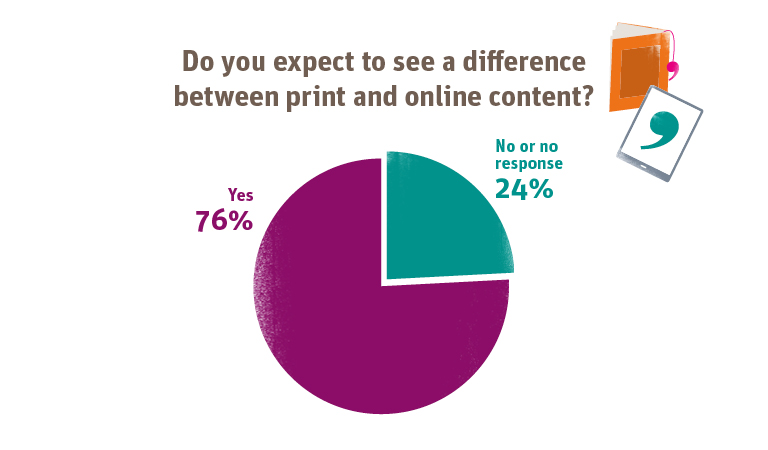 More than three quarters of respondents (76%) expect to see a difference between print and online content, with online content providing differences in the specific content, its format and the allowance for interactivity. Let’s say you read a printed article that includes a graph; the very least you’d expect when viewing it online is a few pop-up boxes when you hover over information points. Video is being used much more, too, but not just ‘regular’ video – we’re seeing huge steps forward in interactive video content. But despite these developments in online formats, what online can’t do (yet) is provide that nostalgia that people love about print – and we must remember this.